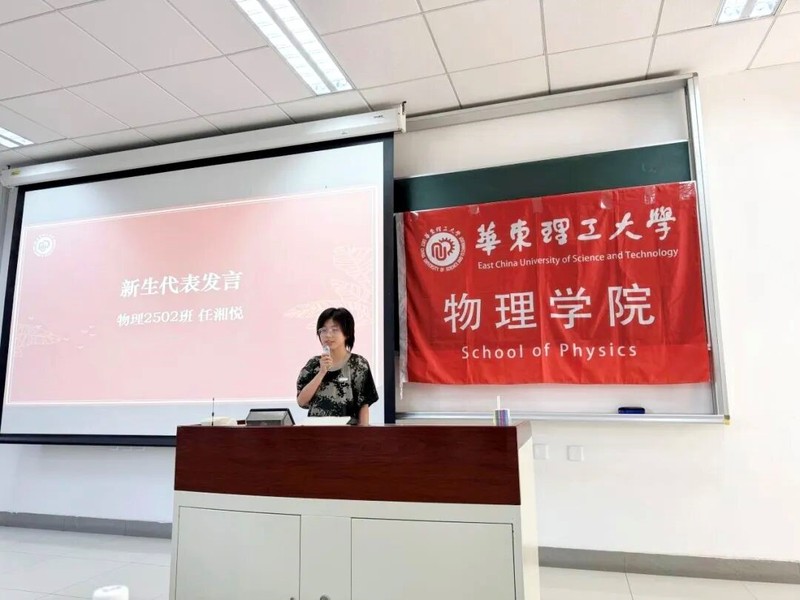 新生代表任湘悦同学分享了她与物理的缘分及未来期许。她因热爱探索世界运行规律而选择物理,兴趣引领她踏上求真之路。面对大学生活,她满怀期待,希望能一直保持对知识的好奇,打牢专业基础,培养科研思维,与同学携手共进。
