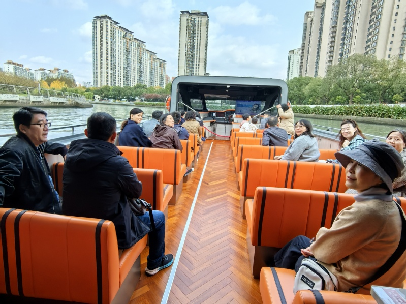 活动伊始,老师们登上游船,从长风码头启航,沿着苏州河溯流而上至昌化路,行程约60分钟。苏州河作为上海的“母亲河”,横跨长宁、普陀、静安多区,串联起城市的历史脉络与现代活力。两岸秋意正浓,红橙黄绿姹紫嫣红,片片银杏树叶被暖阳染成透亮的金黄,微风轻寒,潺潺河水碧绿清澈。视线稍远处,一边是火柴厂湾、凯旋桥等承载历史记忆的工业遗存和特色桥梁,又一边是天安千树、M50创意园区等鳞次栉比的现代化楼宇,二者交相辉映,让人思绪万千,心旷神怡!
