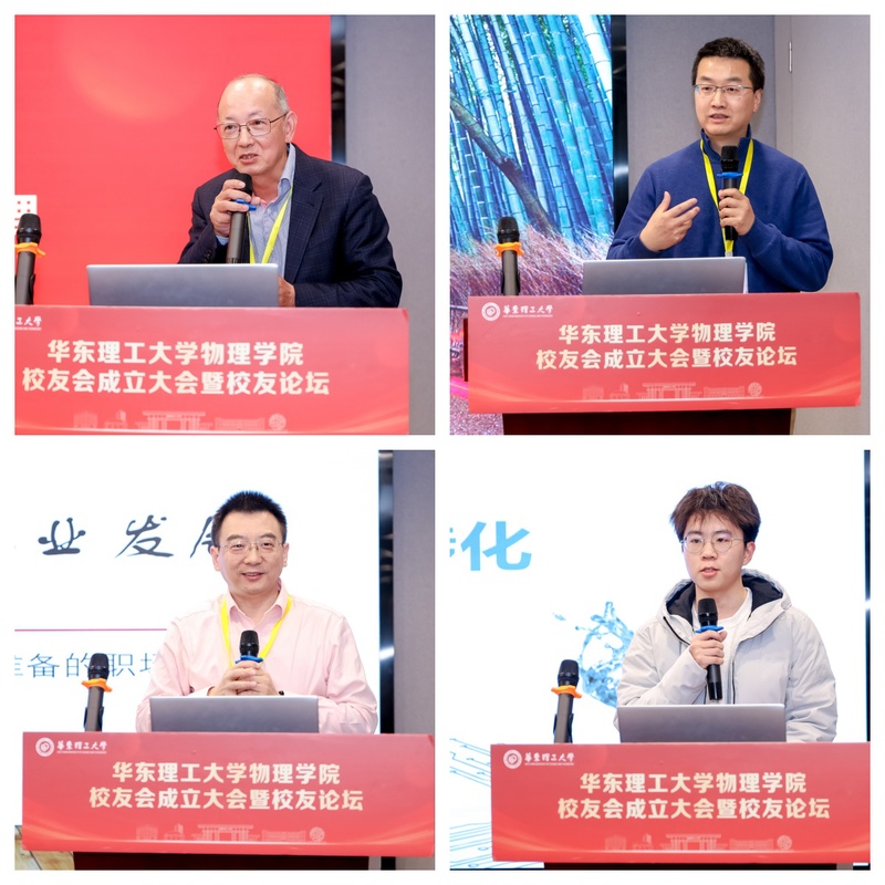 校友论坛环节由理事、80级校友、学院退休教师陆慧担任主持。名誉理事长、83级校友、浙江大立科技股份有限公司董事长兼总经理庞惠民作了题为“热爱专业,放飞梦想”的报告;理事、90级校友、联想集团基础设施事业部产品战略高级总监高健分享了“科技产业趋势”;理事、92级校友、马夸特电子科技(上海)有限公司上海厂厂长梅军围绕“物理人在制造业的职业发展”进行交流;21级校友、中国国际大学生创新大赛(2023)全国金奖团队成员季鑫介绍了“高性能电子墨水开发与转化”项目。与会校友纷纷表示,在母校打下的坚实专业基础为个人事业与人生发展奠定了重要根基。