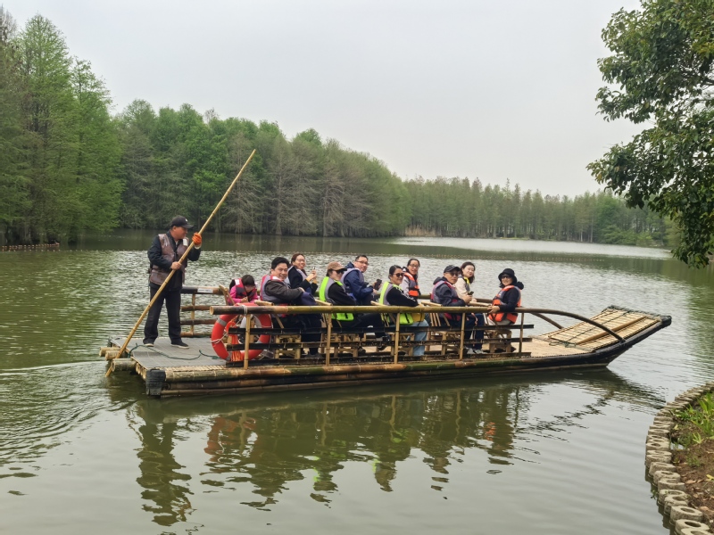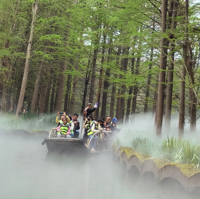 随后,大家继续深入尚湖景区,乘坐竹筏穿梭于迷雾森林。只见挺拔茂盛的池杉林立水中,清幽静谧,竹筏在缭绕的水雾中徐徐前行,周围仙气飘飘,仿若置身幻境,惬意的泛舟之旅让大家彻底融入自然之美。