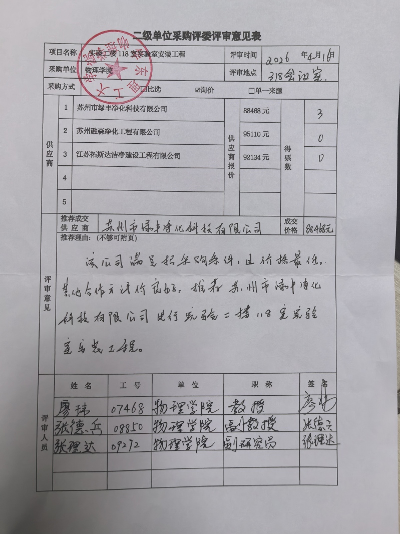 物理学院实验二楼118室实验室安装工程评委评审意见公示(此公示有效期4月16日-4月22日)